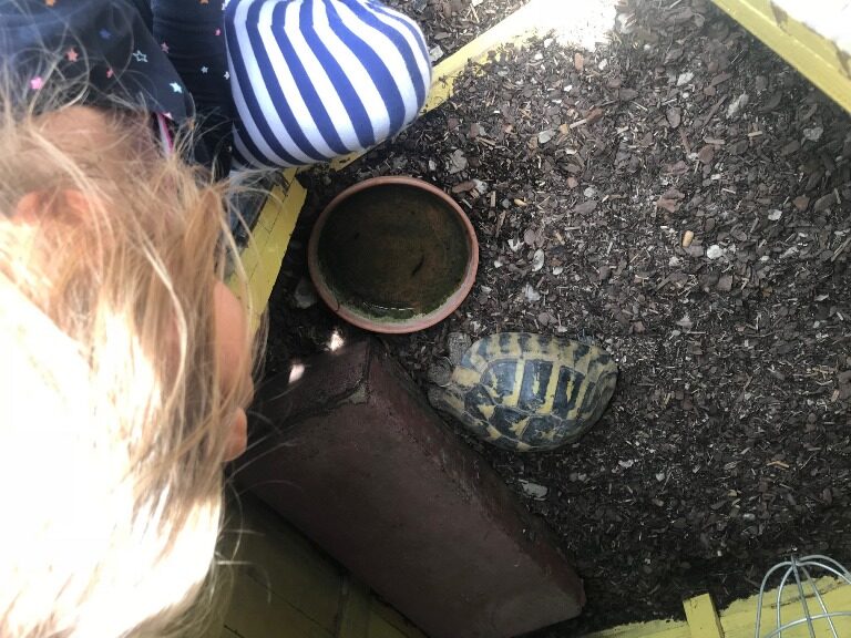 Jedes Jahr staunen wir über unsere Schildkröten. Eingepackt in Laub schlafen Sie vier Monate durch und pünktlich zum Frühlingsanfang kommen sie wieder zum Vorschein. Für die Kinder ist es spannend, diesen Prozess zu beobachten und lehrreich, dies mit zu erleben. Schön wenn unser Vorgarten wieder belebt ist.